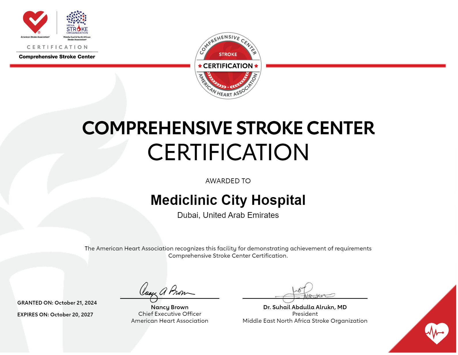 Mediclinic City Hospital is the first in the region to receive the American Stroke Association and Middle East North Africa Stroke Organization Comprehensive Stroke Center Certification.